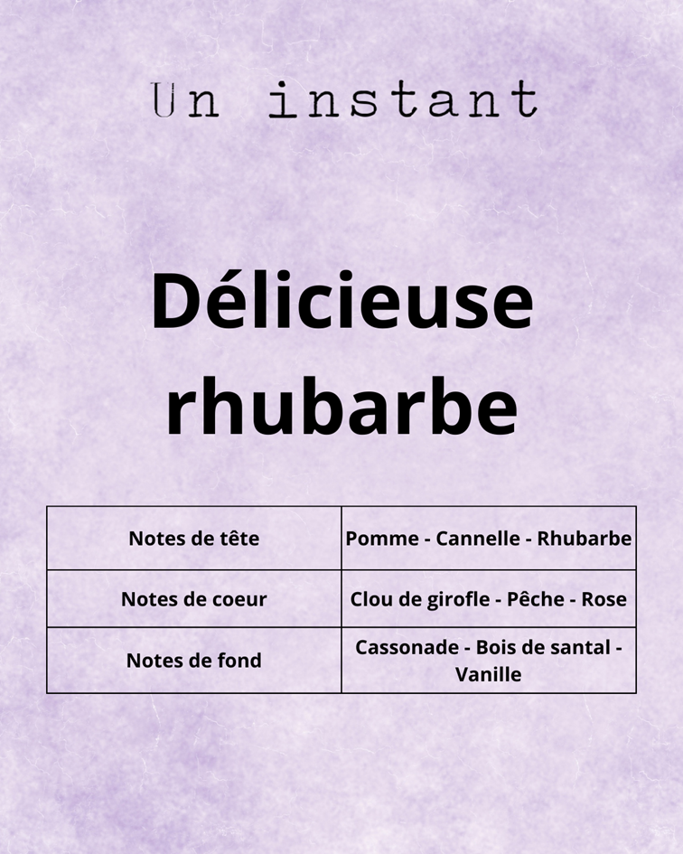 Délicieuse Rhubarbe évoque le parfum réconfortant d'un dessert qui mijote doucement. Dès les premières notes, la rhubarbe se mêle à la pomme cuite et à la cannelle pour une ouverture fruitée et légèrement épicée. En cœur, la pêche et la rose apportent rondeur et douceur, rehaussées d'une pointe de girofle. Le fond dévoile un accord chaleureux de cassonade, de bois de santal et de vanille, pour une ambiance aussi douce qu'un goûter d'automne.